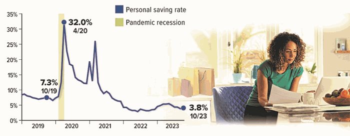 The U.S. personal saving rate — the percentage of personal income that remains after taxes and spending — was 3.8% in October 2023. The saving rate spiked to an all-time high during the pandemic, when consumers received government stimulus money with little opportunity to spend, but fell quickly as stimulus payments ended and high inflation ate into disposable income. The current level is well below pre-pandemic saving rates.