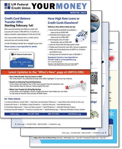 News & Promotions What's New Current Promotions Newsletters Your Money Newsletter - Winter 2026 Get the latest information on new services, current promotions and other news with our quarterly Your Money newsletter. Credit Card Balance Transfer Offer Starting February 1st! Have High Rate Loans or Credit Cards Elsewhere? Latest Updates to the “What’s New” page at LMFCU.ORG Attending a Local Boat or RV Show? Lend a Hand and Donate To The Johns Hopkins Children’s Center TurboTax Member Discounts! Get a $50 Bonus Deposit When You Open a New Membership! Attention College & Trade School Students:Scholarship Opportunity! Auto Loan Rates Lowered! Use Payroll Deduction to Automate Your Savings Auto & Truck Extended Warranty Program! Having Financial Problems? Contact Money Management International, a non-profit financial counseling agency. Level Up Your Finances in the New Year Check Out Our Mobile Banking App! Welcome Lockheed Martin IWSS/Radar and Sensor Systems employees Your Money - winter 2026