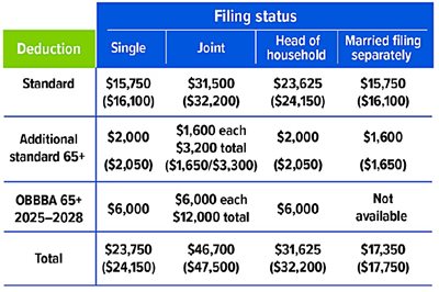 The new senior deduction is available regardless of whether a taxpayer takes the standard deduction or itemizes. For those who take the standard deduction, it is in addition to the standard deduction (which applies to all taxpayers) and the already existing additional standard deduction for taxpayers age 65 and older. The combination of all three deductions could result in a substantial reduction of taxable income. These are the deductions for tax year 2025, with deductions for tax year 2026 in parentheses.