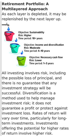 One way to think about your retirement portfolio is as a series of layers that could work together to pursue all three objectives. The bottom layer would be comprised of short-term, liquid vehicles designed to provide the cash flow needed for, say, one to three years. The middle layer would contain additional amounts needed within a decade or so and be made up of moderate-risk vehicles that aim to provide a stream of income and help balance inevitable volatility. The top layer, which would include the balance of your portfolio, would be designed to outpace inflation and pursue longerterm growth, striving for that necessary sustainability. Over time, as one layer is depleted, it can be replenished by the next layer up.